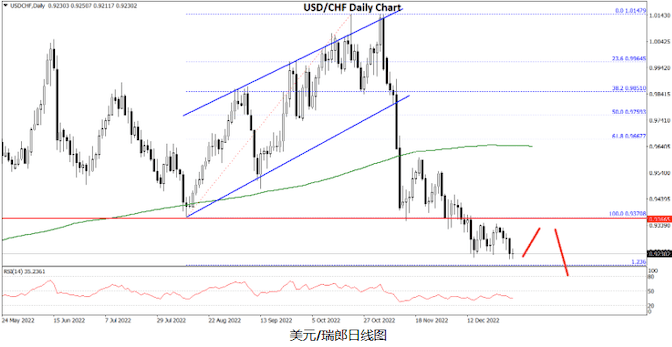 欧元/美元上涨至1.0200阻力区上方。美元兑瑞郎正在下跌,仍面临跌破0.9200支撑位的更多损失的风险。