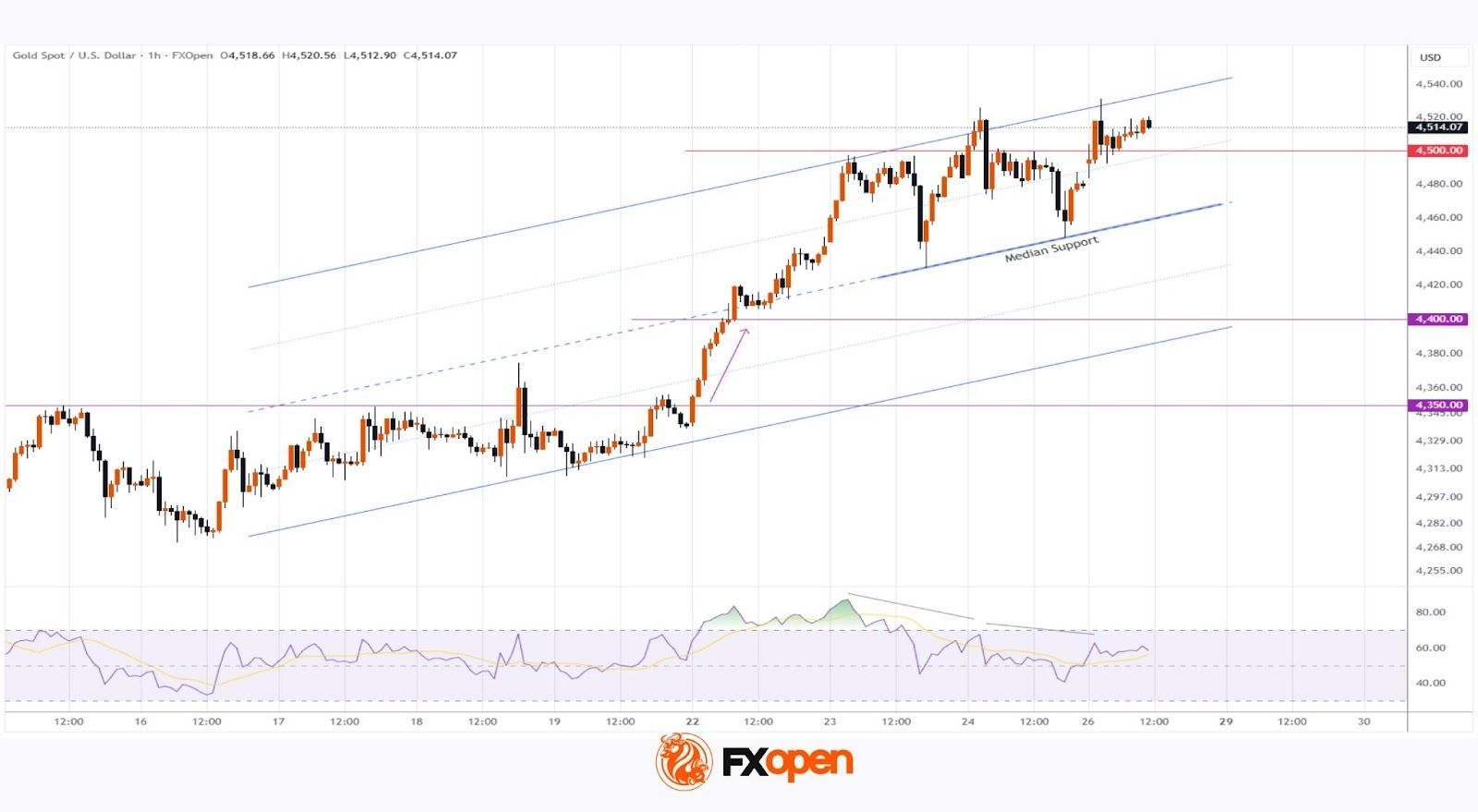→ 在突破 4,350 美元水平(如箭头所示)后,价格稳步上涨至 4,400 美元;