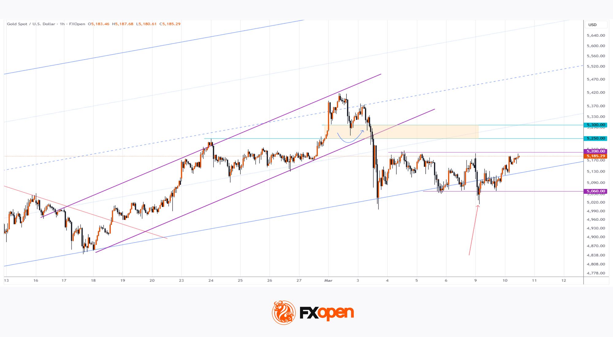 从 XAU/USD 图表可以看出,过去几个交易日里,黄金价格一直维持在 5,060 美元至 5,200 美元的区间内。