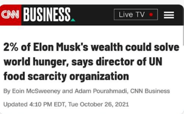 联合国官员点名,希望包括马斯克在内的世界富豪捐款,只需60亿美元就能帮助解决全球饥荒等问题。媒体报道后,这种说法演变为只要马斯克捐出2%的财富,就能解决世界饥荒,一时闹得沸沸扬扬。