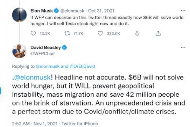 马斯克回应了比斯利的捐款请求,后来在推特上写道:如果(联合国世界粮食计划署)能够描述。。。确切地说,我将立即出售特斯拉股票并做60亿美元将如何解决世界饥饿问题。