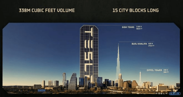 在这场盛大的开幕式上,主角自然是特斯拉的德州超级工厂,也是马斯克演讲的重点。马斯克说,德州超级工厂是世界上最大的工厂。如果把德州超级工厂倒过来,高度将达到1166米,比世界上最高的迪拜塔高337米。
