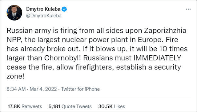乌克兰外交部长库列巴周四在推特上说:俄罗斯军队正从四面八方向欧洲最大的核电站扎波罗热核电站开火。火灾已经发生了。一旦它爆炸,危害将是切尔诺贝利的10倍。俄罗斯人必须立即停火,让消防员建立一个安全区。